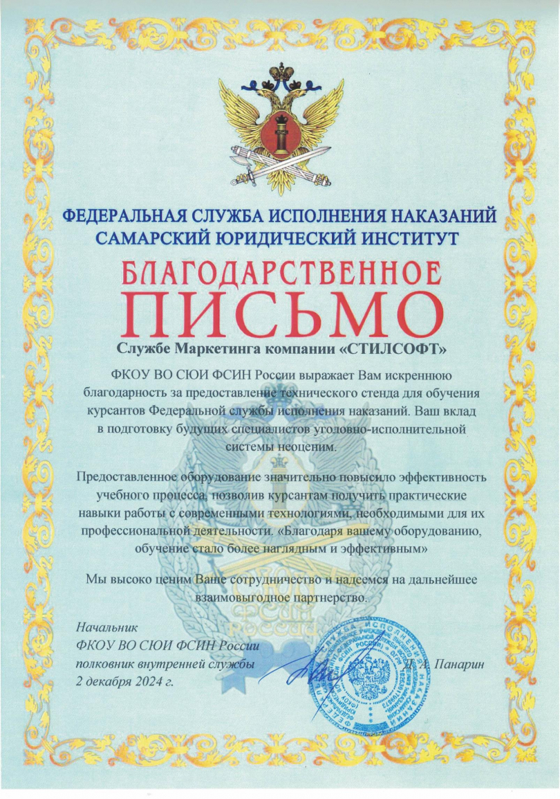 Благодарственное письмо Службе Маркетинга «СТИЛСОФТ»
