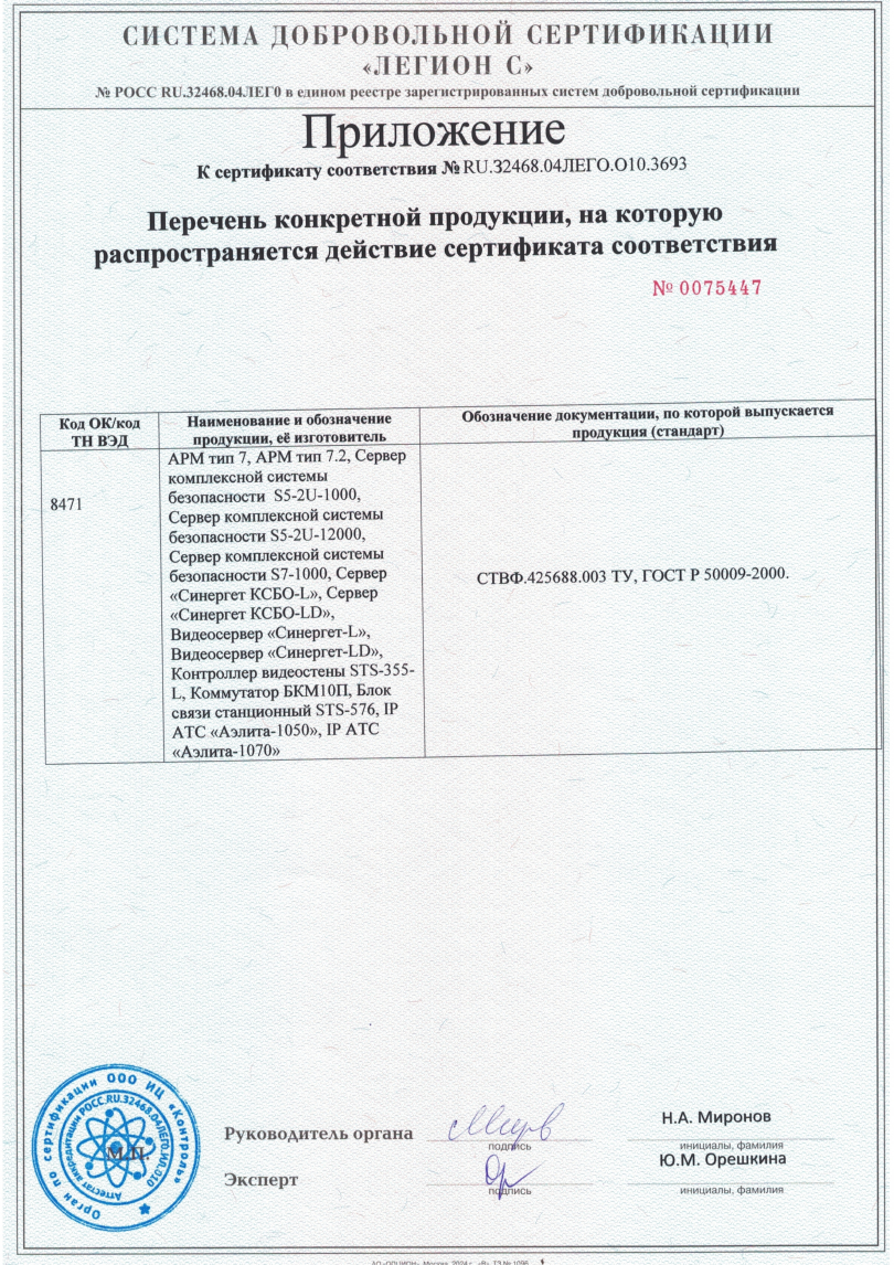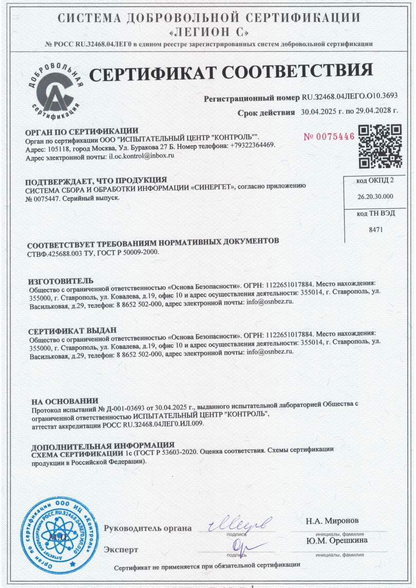 Сертификат соответствия. Система сбора и обработки информации «Синергет»